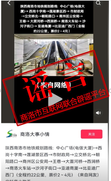 真相:近日,有網民在網絡平臺發布“陜西商洛市地鐵規劃路線”信息,并配圖片。經與商洛市發改委和市交通局核實確認,我市暫無建設地鐵的規劃,該信息為謠言。