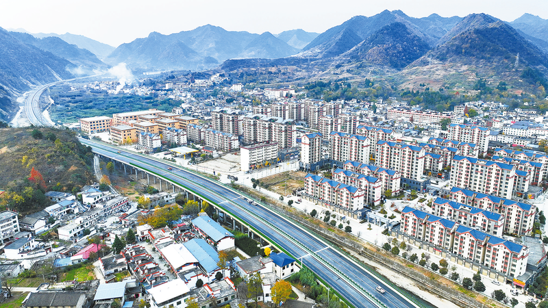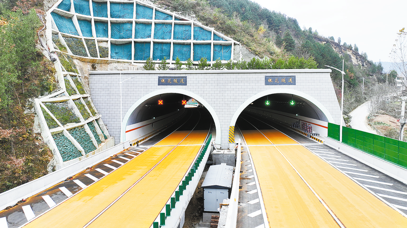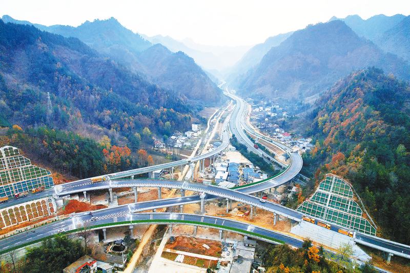 11月21日,在丹鳳縣竹林關鎮,新完工的高速互通立交與群山蜿蜒交錯,公路主線已達到通車條件。在1標段的穿倉嶺隧道口,工人們正在做項目收尾的綠化施工。