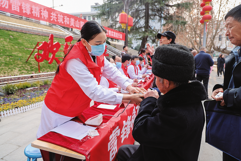 ?為進(jìn)一步弘揚(yáng)雷鋒精神和志愿服務(wù)精神,3月5日,山陽(yáng)縣人民醫(yī)院組織呼吸內(nèi)科、消化內(nèi)科、交大一附院頜面外科等5個(gè)專科業(yè)務(wù)骨干組成志愿服務(wù)隊(duì),在縣政府廣場(chǎng)開(kāi)展學(xué)雷鋒健康義診活動(dòng),用實(shí)際行動(dòng)詮釋雷鋒精神。 (本報(bào)記者 張 英 攝)