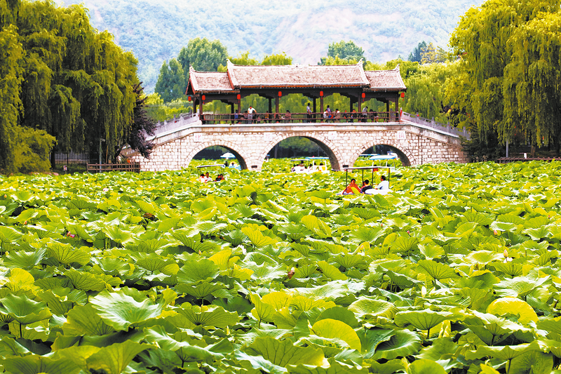 在丹鳳縣棣花古鎮(zhèn),游客泛舟千畝荷塘。(本報記者 楊 鑫 攝)