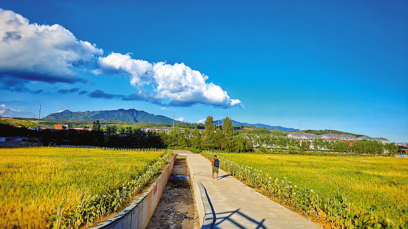 9月17日,洛南縣保安鎮農業觀光園內,藍天、白云與黃綠色的稻田構成一幅畫。
