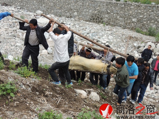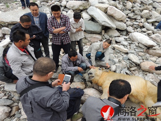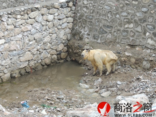 當(dāng)?shù)匾幻心陭D女說,這頭羚牛兩天前已經(jīng)在上面的溝邊活動(dòng),還跑到縣水務(wù)局在這里開建的水利工地來了,民工把它趕進(jìn)山溝,可是昨晚工地放工后,羚牛沿河谷又跑到這里,被攔河壩擋住了,不然的話它可能沿河道跑到下邊去了。