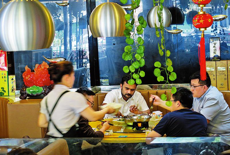 梅曉靜和丈夫田宏新開的酸菜魚土菜館,經(jīng)常有外賓光顧。(5月3日攝)