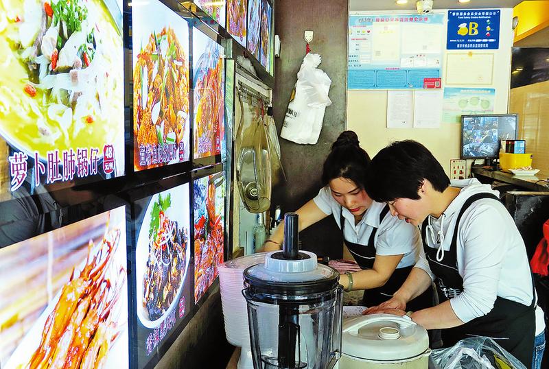 梅曉靜(右)忙著分外賣單。因?yàn)椴似犯挥刑厣赓u訂單量十分可觀。(5月3日攝)