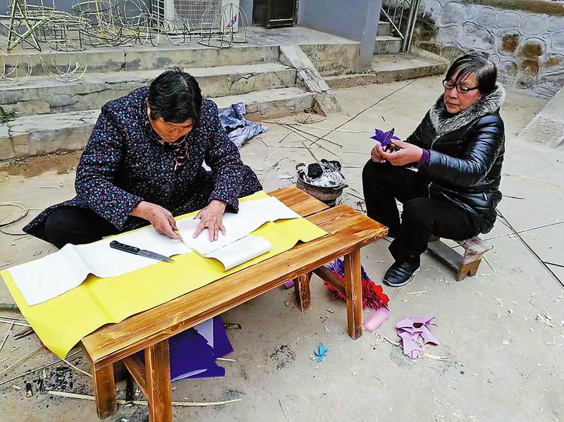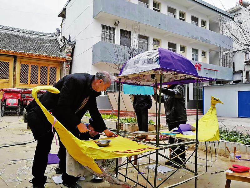 在制作花燈的團隊里,王玉蘭主要負責裱糊及裝飾。對于扎花燈,王玉蘭特別有經驗:“以前花燈里用的是蠟,用枸樹皮做的綿紙裱糊,裱一層,再裱一層?;粢煤芏喾N顏色,襯托得花紅柳綠,格外喜慶。全架燈48對,半架燈24對,雞、船、魚、西瓜……心里想的都可以做出來。”王玉蘭拿出自己拍的花燈視頻,開心地講述她與花燈的緣分?;舻墓ば螂m然算不上復雜,但也極需耐心,先是根據圖案定好紙張的大小,再搭配好顏色,按照自己的想象將其糊上,糊起之后還要對花燈裝點一番。