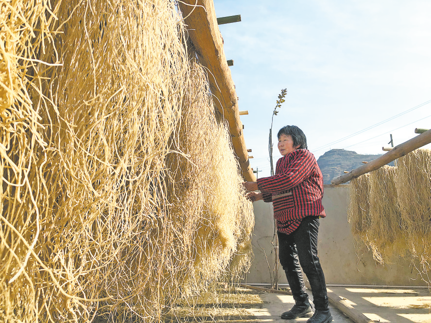 △萬(wàn)灣社區(qū)充分調(diào)動(dòng)黨員群眾發(fā)展產(chǎn)業(yè),人均年純收入突破2萬(wàn)元。圖為萬(wàn)灣村集體經(jīng)濟(jì)粉條加工廠內(nèi),群眾正在晾曬粉條。