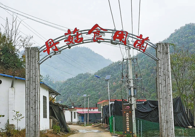 從蔣家莊跨過一道斜碥,進(jìn)入丹鳳境內(nèi),來到梅莊村,映入眼簾的是“丹菇食用菌”產(chǎn)業(yè)基地的拱門。