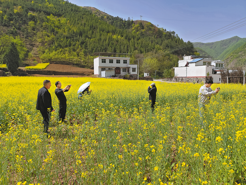 4月10日,游客在丹鳳縣竹林關(guān)鎮(zhèn)孤山坪村油菜花海賞花拍照。孤山坪村在市信訪局的包扶支持下,通過扶持產(chǎn)業(yè)發(fā)展,建成臨潼石榴產(chǎn)業(yè)基地,擴大油菜種植面積,不僅增加了群眾收入,還帶動了美麗鄉(xiāng)村旅游,描繪出村美民富新畫卷。(本報記者 賈書章 攝)