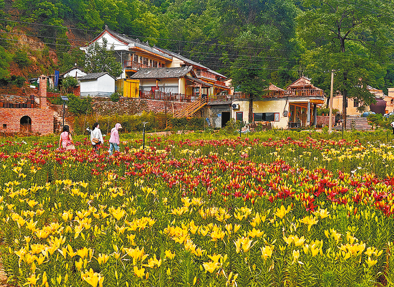 盛夏6月,漫步在丹鳳縣龍駒寨街道資峪溝村的青石板路上,古色古香的三里棧原鄉民宿掩映在連片的百合花海中,在遠處的秦嶺山脈襯托中,顯得更加寧靜雅致。幾名游客擺起了姿勢,在花海中拍照。