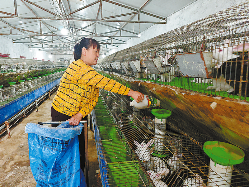 夏日的丹鳳縣花瓶子鎮花中村,恒豐源兔業養殖專業合作社的大棚內一片喧鬧,幾千只肉兔在籠內擠擠挨挨,嚼食青草的“沙沙”聲與嘰喳輕喚連成一片生機勃勃的奏鳴曲。合作社負責人代銀芳俯身仔細檢查一只母兔的狀況,手指撫過兔子的脊背,臉上浮現出溫和的笑意。