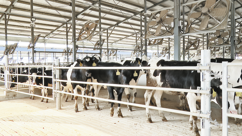 新引進(jìn)的奶牛在配備有自動(dòng)牛體刷等設(shè)施的牛舍內(nèi)悠閑地活動(dòng)