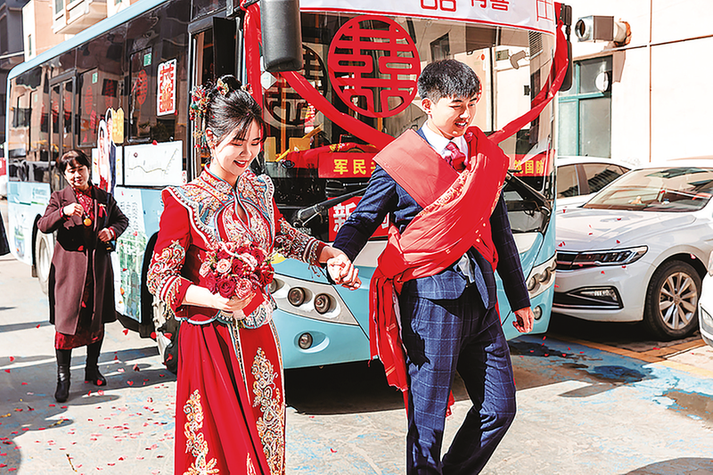 巴圖莉的新式婚禮,在洛南并非個例。洛南縣城關街道居民田添說,今年3月11日是自己和新郎張園濤結婚的好日子,但他們沒有乘坐轎車,而是選擇了乘坐公交車。“與豪華車隊相比,公交車更有性價比,氛圍感更好。”新娘田添說。