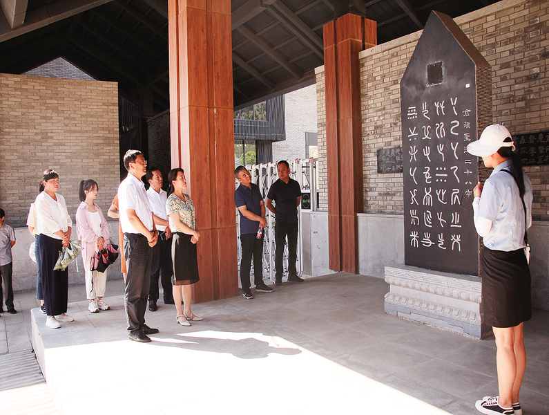 游客在倉頡文博館“倉頡在洛南造二十八字”石碑前聆聽講解員講述倉頡傳說。