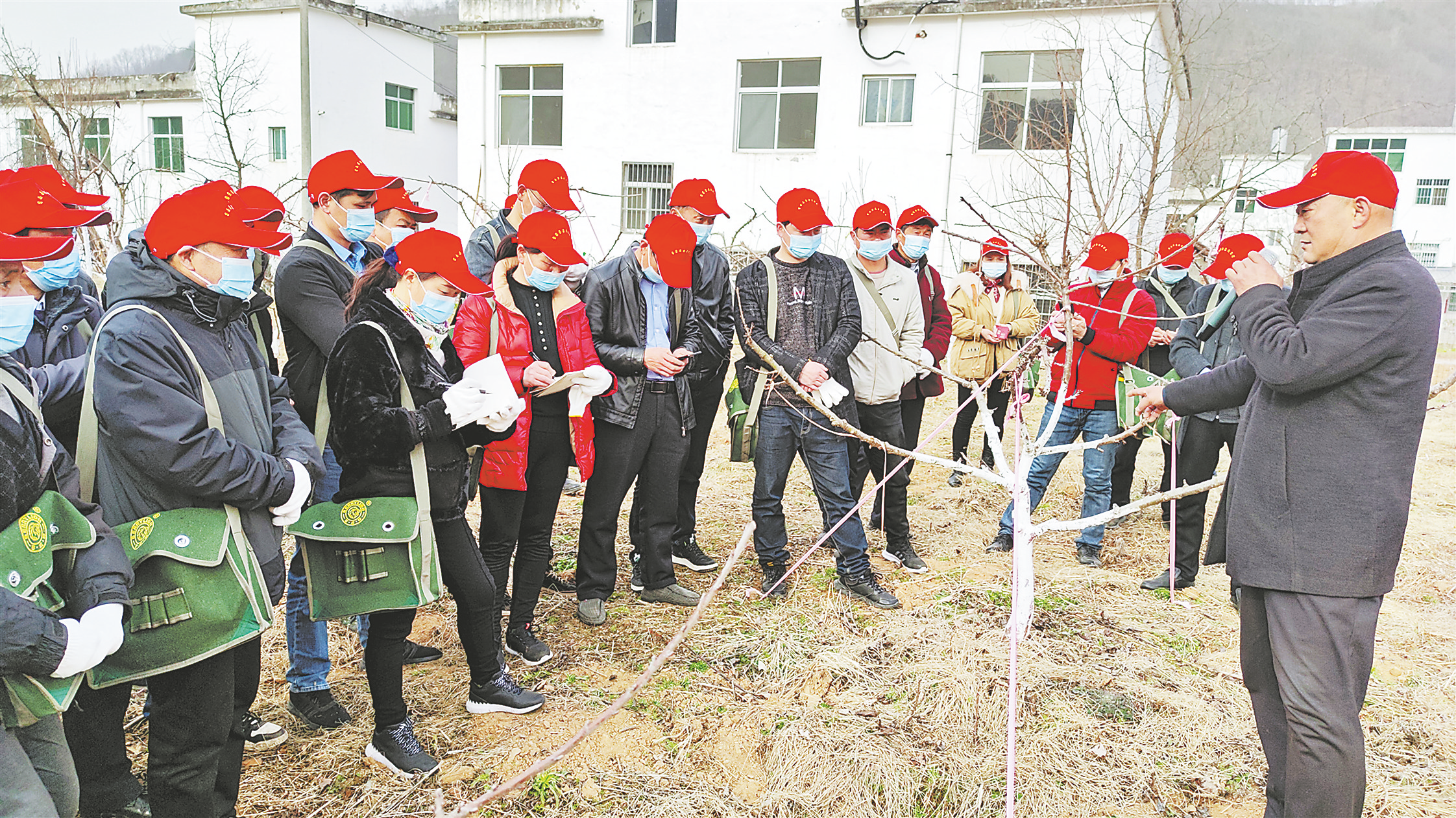 近期,商南縣農業農村局組織開展“科技服務三農行”暨高素質農民林果科管培訓班,邀請商南縣林果專家孟水平及果業基地技術人員對全縣果業種植戶及有意發展種植果業的群眾進行技術培訓,提升果農科管技術,助力果農豐產增收。圖為3月1日,林果專家及技術人員在商南縣過風樓鎮小栗園大櫻桃基地,就果樹整形、修剪、拉枝、嫁接等方面向群眾講解先進科管技術,手把手進行示范操作。 (代緒剛 攝)