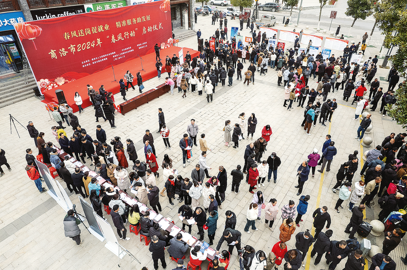 2月19日,商洛市2024年“春風行動”啟動儀式在商南縣西街廣場舉行,40多家市內重點企業代表、10家浙江企業代表、10家南京企業代表、9家咸陽企業代表、8家人力資源公司代表以及商南縣各鎮村的富余勞動力、退役軍人、高校畢業生、搬遷群眾等求職人員2000多人參加了活動。據了解,現場提供的5000多個招聘崗位,涉及加工制造、金融商貿、電子科技、汽車制造等多種行業。 (本報記者 胡 蝶 攝)
