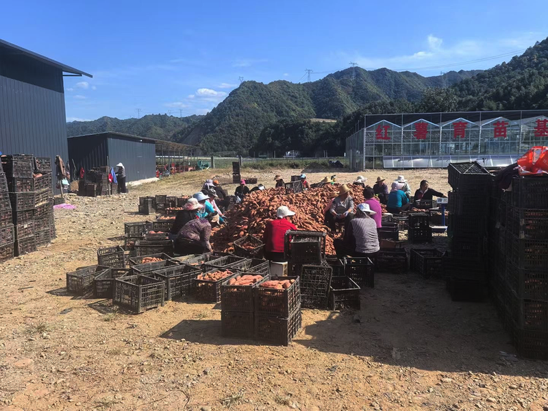 在秦嶺蜜薯種植基地,隨著挖薯機在田埂間來回穿梭,翻滾的泥土中,一顆顆紅潤誘人的紅薯紛紛探出頭來,務工群眾正在給新出土的蜜薯去泥、分揀、裝箱,一堆堆剛出土的紅薯擺滿田間地壟,個個體態(tài)飽滿、顏色鮮艷,煞是喜人。田間呈現(xiàn)一派繁忙豐收景象。蜜薯晾曬一個小時后,按照大小規(guī)格進行初步分級——小薯、中薯、大薯裝入紙箱,然后裝車運往倉庫,發(fā)往全國各地。