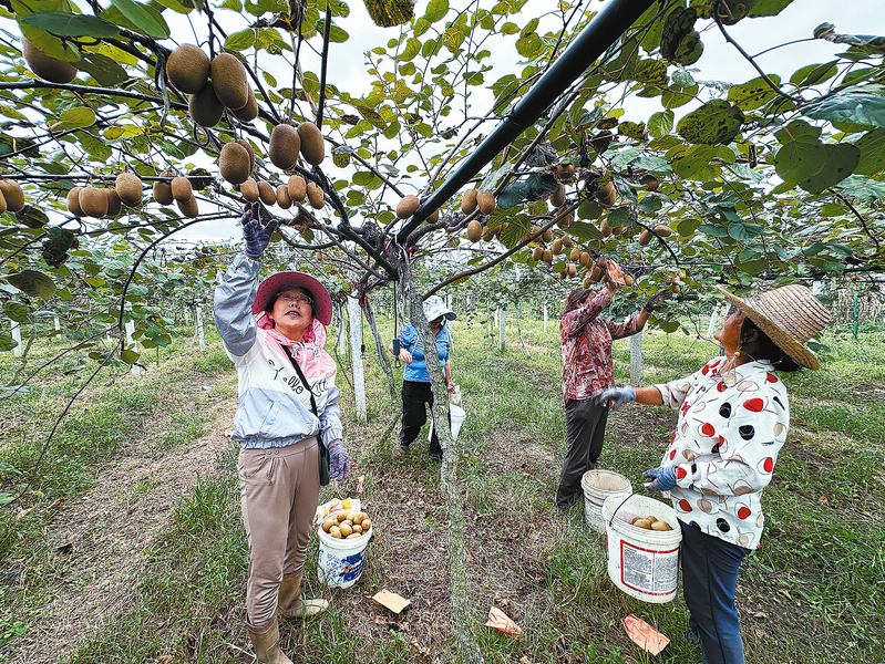 9月15日,在商南縣富水鎮王家莊村的種植基地里,工人正在采摘獼猴桃。該基地栽種有徐香、金桃、金艷、G3等多個品種的獼猴桃210畝,目前已經進入豐產期。預計今年產量可達到100噸,年產值80萬元,直接帶動周邊群眾穩定增收。 (本報記者 胡 蝶 攝)