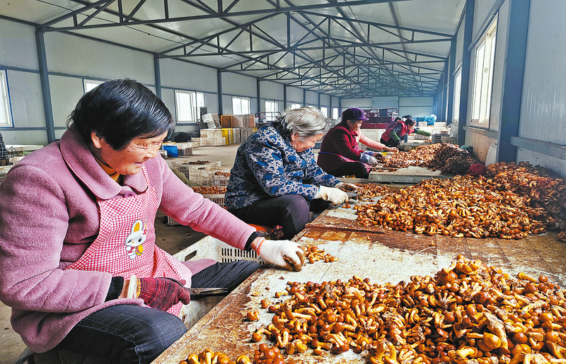 在高壩店鎮(zhèn)食用菌產(chǎn)業(yè)園加工廠,七八名婦女正圍著臺板專注地剪菇根,熟練的動作行云流水。