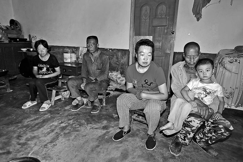 表明來意后,老人招呼我們在院里坐下,小孫子緊緊依偎在爺爺?shù)膽牙铩L崞鸺依锏木硾r,老人眼淚唰一下流了出來。