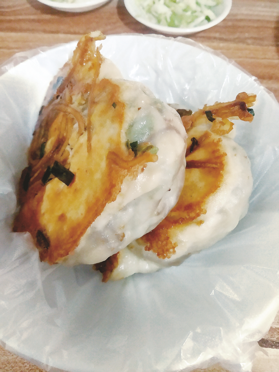 金燦燦、水靈靈、圓鼓鼓、皮薄餡飽的水煎包幾經周折,終于呈現出了最誘人的姿態,三四個就能裝滿一大碗。兩根筷子一手一根,筷子尖同時發力,將大包子從中間割裂開來,充盈的粉條混合著少許韭菜和豆腐同時翻涌而出,一股子香氣頃刻間飄逸靈動。幾勺懸浮著白色芝麻粒的鮮紅辣椒油澆上去,水煎包再次呈現出勾人味蕾的魅力,辣、燙、嚼勁兒十足,個個食客吃得酣暢舒坦,臉上洋溢著滿足感、幸福感。要知道,新出鍋的水煎包是最佳食用時間。