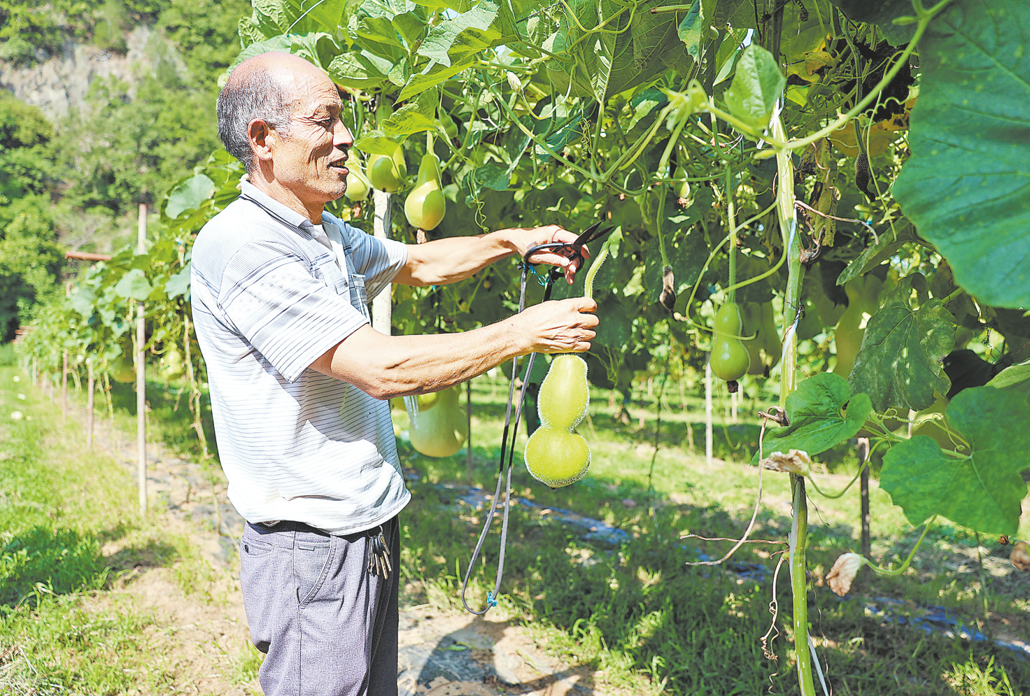 謝培廣說,去年夏季由于雨水過多,葫蘆長勢沒有預期好,所以今年他更加用心管理,提早做好了預案。他親力親為,精心做好各項環節的管護。忙不過來的時候,他就雇周圍的村民來幫忙。“今年葫蘆長勢很不錯,預計這些葫蘆成熟后,能收入十來萬元。”謝培廣算著收入,臉上綻開了笑容。
