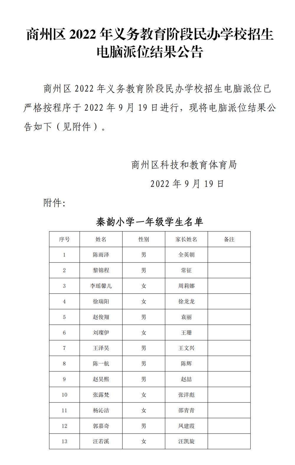 商州區2022年義務教育階段民辦學校招生電腦派位結果公告