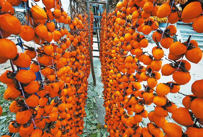 據(jù)了解,做柿餅必須在柿子還未成熟,但顏色已經(jīng)從青色完全轉(zhuǎn)為橘色,甜度飽滿且具有硬度的時(shí)候采摘和去皮,然后晾曬一個(gè)月左右。如果經(jīng)過幾場(chǎng)霜降之后,樹上還未采摘的柿子便會(huì)完全成熟轉(zhuǎn)為大紅色,整體軟化甚至掉落,不具備做柿餅的條件。所以,制作柿餅要趕在霜降前后一周左右的時(shí)間內(nèi)完成。