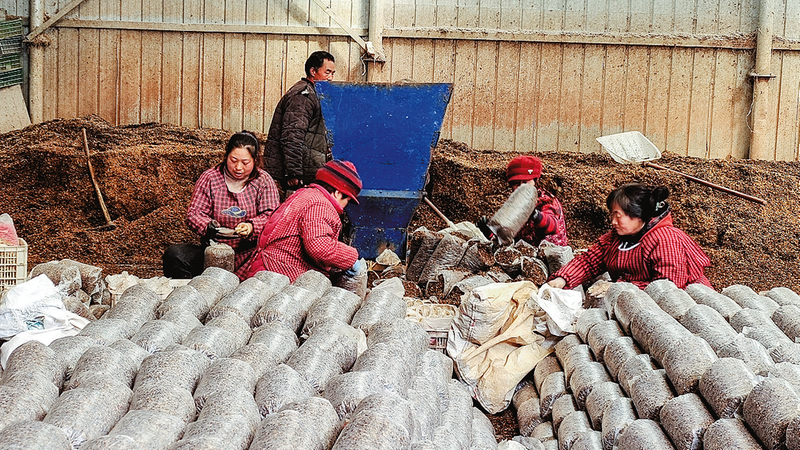 “每年春季開始生產,邊做棒子邊生產,蒸好以后滅菌、接種,然后就要出菇了。一年加工20萬袋,很實惠。”秦關社區產業大戶陳民干說。