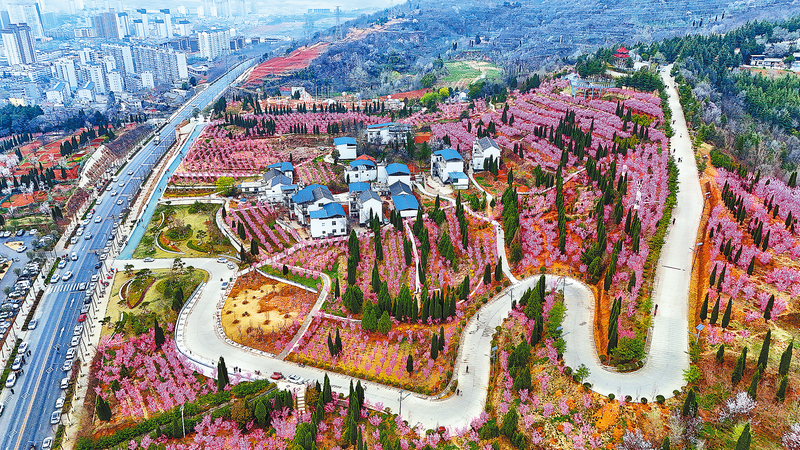3月24日,商州區金鳳山花海公園內紅梅進入盛放期,吸引了大批游客前來賞花,成為商州旅游的網紅打卡地。(本報記者 楊 鑫 攝)