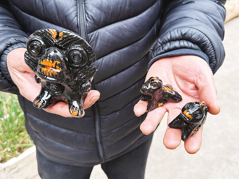 這還只是初步的過程,捏狗娃咪很快,陳五斤捏一個中等大小的狗娃咪成坯大概用時在兩分鐘。捏制好的成坯還要放在小院兒里晾曬,待干后置于廚房的灶膛中,用燒飯時的火候燒制半個多小時后取出,待溫度適中時,以松香涂其身,則顯通體烏黑錚亮,再以黃膽紅點綴,整個制作便完成了。“燒制過程比較考驗技術,要掌握火候,不然容易炸開。”陳五斤介紹。