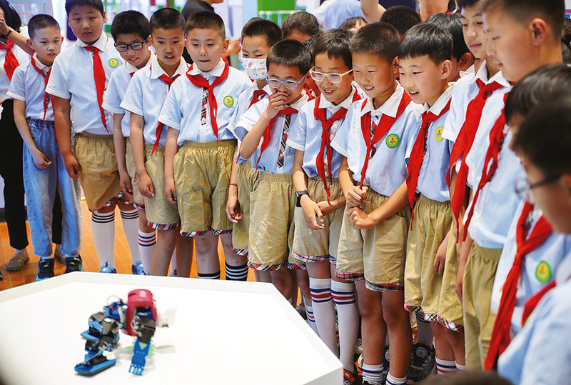 5月15日,在商州區科普館,孩子們高興地和機器人互動。