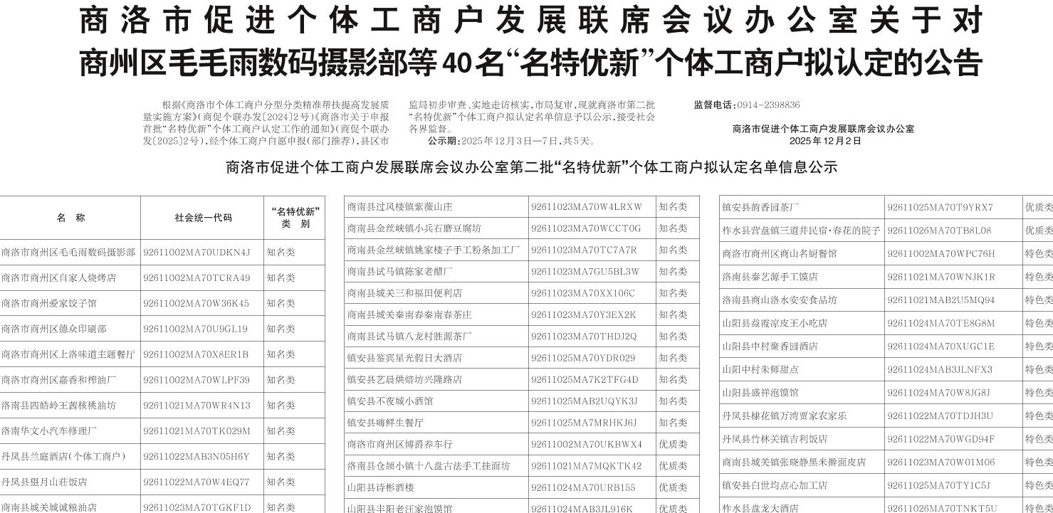 商洛市促進個體工商戶發展聯席會議辦公室關于對商州區毛毛雨數碼攝影部等40名“名特優新”個體工商戶擬認定的公告