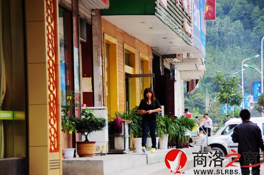 一女孩從擺滿盆景的某店鋪門前走過