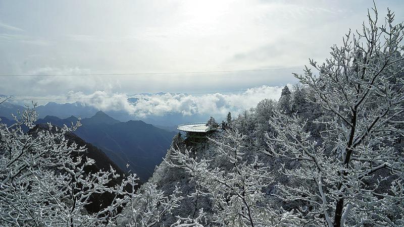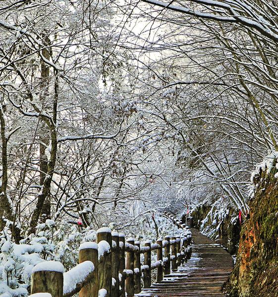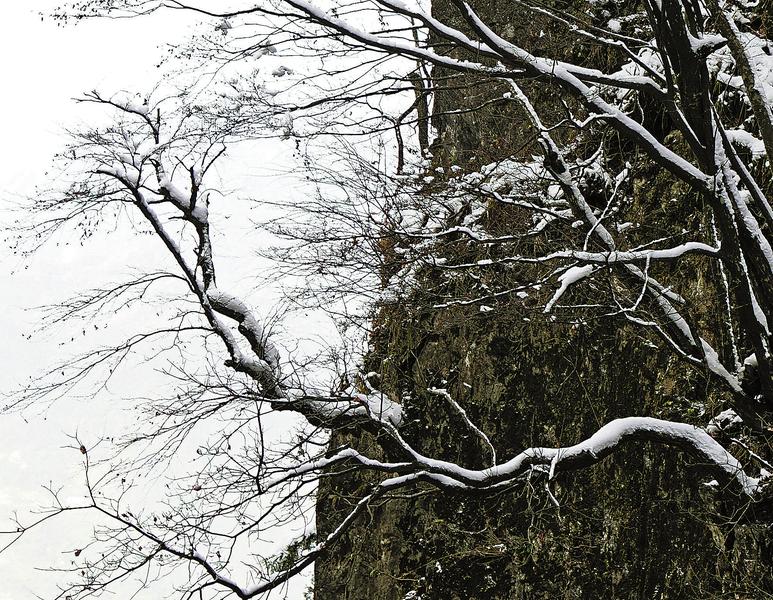 塔云山海拔1600多米,氣溫低,每當山下冬雨紛紛時,這里已是雪花飄飄,銀裝素裹。山上植被高達95%以上,到處是蒼松翠柏,使這里形成了千奇百怪的霧凇景觀。那落葉的樹枝突然變得肥胖,一棵樹就是一盆珊瑚奇景;那些沒有落葉的喬木、灌木,在冬雪的裝扮下開出棉花般的大團花朵;那歷經五百多年的道觀,被白雪悄然覆蓋,變得更加圣潔靜謐。在這潔白的世界里,塔云山的每一處景觀、每一個建筑,都是一幅水墨畫,讓人過目難忘。