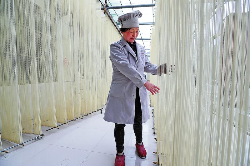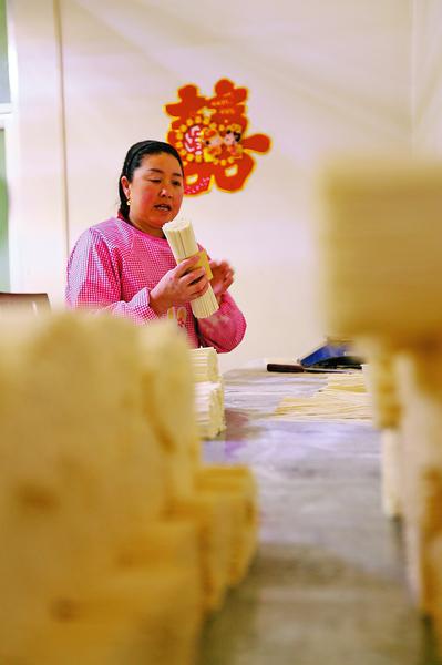艾萬玉檢查掛面質量