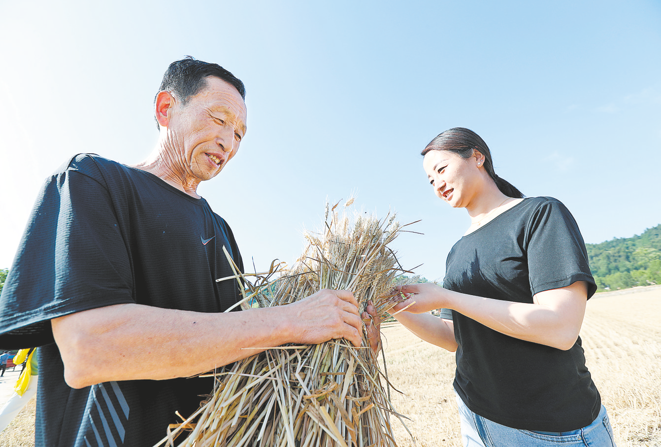 如數家珍 原村委會主任陳伯平和現任村委會副主任張文娜交流小麥收成。