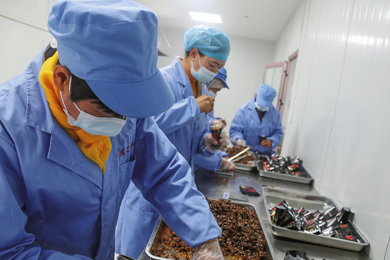 走進公司,馬云珍正忙著打包剛生產的牛肉干。“我家就住在附近,平時除了照顧家里外,就在這兒上班,一年能掙2萬多元呢。”