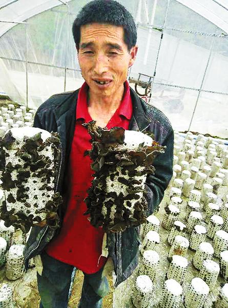 在中坪基地確定貧困戶借耳時,殘疾人貧困戶朱立印提出了申請。村干部看到他一只腳殘疾,行動不便,年齡已有65歲,妻子也是聾啞人,建議他不參加這個項目,老人家卻說:“我還能動,我不能拖大家后腿,等著國家給我兜底扶貧。”大家都被他這種不等不靠的精神所感動,基地其他貧困戶都來給他幫忙刺孔、掛袋,前期任務順利完成。經過20多天的細心管理,看到拱出的耳花和長大的木耳,朱立印輕撫著菌袋激動地向村干部和技術員說:“我們農村人養(yǎng)兒防老,指望兒子。這木耳就是我兒子啊,有了木耳,脫貧就有了指望。”